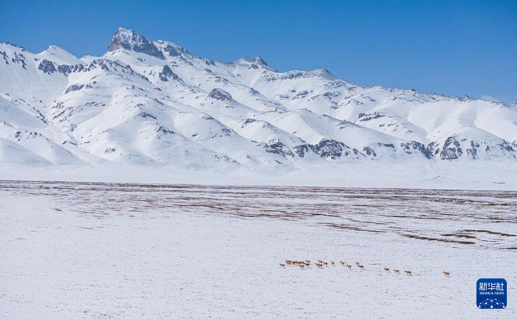 大群遷徙的藏羚羊翻越覆蓋著積雪的山梁(5月10日攝)。新華社記者 姜帆 攝