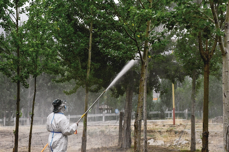 病因找到了,如何對癥下藥才是關(guān)鍵。防治隊將整片楊樹林分成三個區(qū)域,首先伐掉干死腐爛的樹,其次對病害區(qū)域進行殺菌消毒?!懊總€區(qū)域我們噴灑的藥劑也不同,主要是想對防治效果進行實驗。通過持續(xù)兩個月的觀察,發(fā)現(xiàn)第一組藥劑防治效果明顯,因此我們開始在整片楊樹林推廣第一組藥劑?!秉S敏說。
