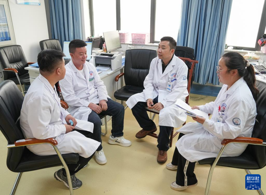 在日喀則市人民醫(yī)院,胡健衛(wèi)(右二)與徒弟段穎騫(左一)、張武(左二)、潘亞茹在辦公室內(nèi)開會(7月8日攝)。新華社記者 丁汀 攝