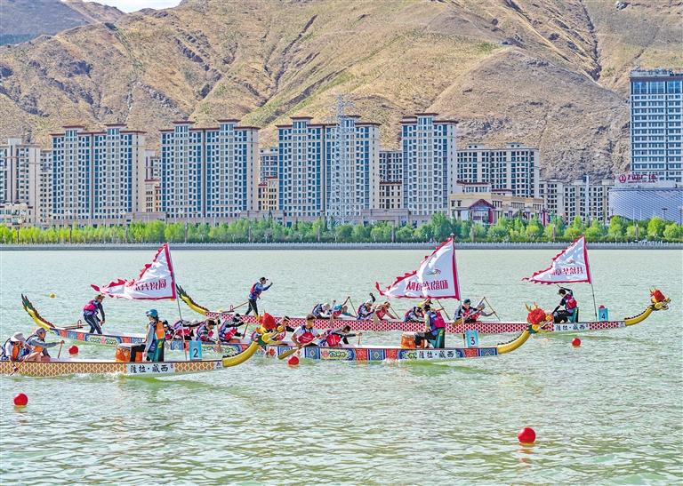 在拉薩首次舉辦的中國海拔最高的城市龍舟賽。 新華社記者 孫非 攝