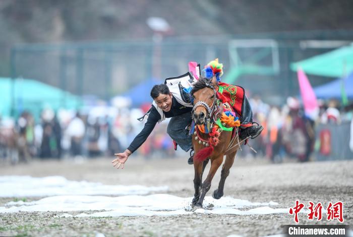 7月21日,西藏自治區(qū)拉薩市堆龍德慶區(qū)馬鎮(zhèn)朗巴村民眾賽馬歡度“望果節(jié)”?!巴?jié)”民俗已有1500多年的歷史,是國家級非物質(zhì)文化遺產(chǎn)。圖為騎手進(jìn)行馬術(shù)表演。中新社記者 貢嘎來松 攝