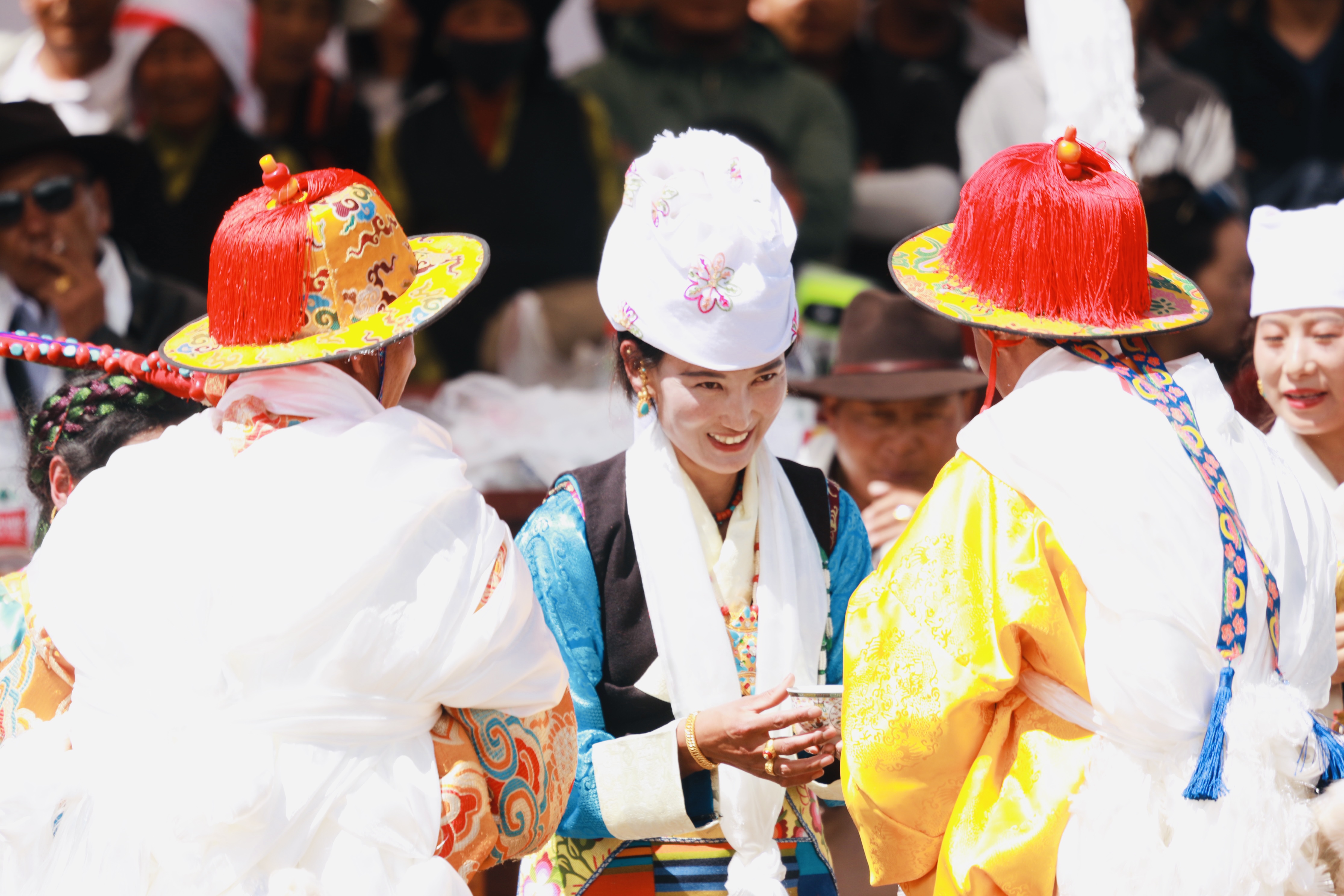 據(jù)悉,賽馬是西藏各地為慶祝豐收舉行“望果節(jié)”(賽馬節(jié))時(shí)的傳統(tǒng)慶典活動(dòng),是群眾最為喜愛、流傳最廣的體育運(yùn)動(dòng)之一。圖為沖許嘛(藏語(yǔ)意為“敬酒者”)為騎手唱歌、敬酒、敬茶。