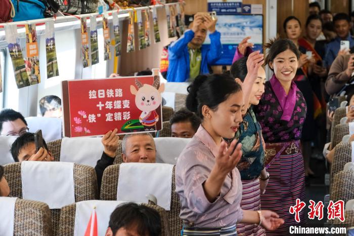 8月16日,西藏拉日鐵路通車十周年。作為連接拉薩與日喀則間的高原城際鐵路,十年來,拉日鐵路運送旅客超1429萬人次,運送貨物超524萬噸。圖為16日,中國鐵路青藏集團有限公司職工在C885次動車組列車上表演鍋莊舞,與乘客共同慶祝拉日鐵路通車十周年。中新社記者 江飛波 攝