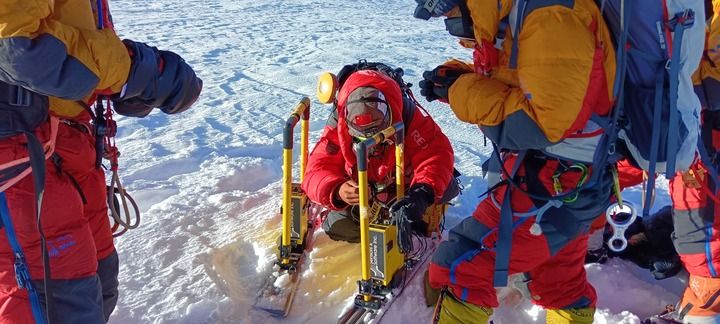 科考隊(duì)員用雷達(dá)測厚儀,在海拔8201米的卓奧友峰峰頂測量冰雪厚度(2023年10月1日攝)。 新華社發(fā)