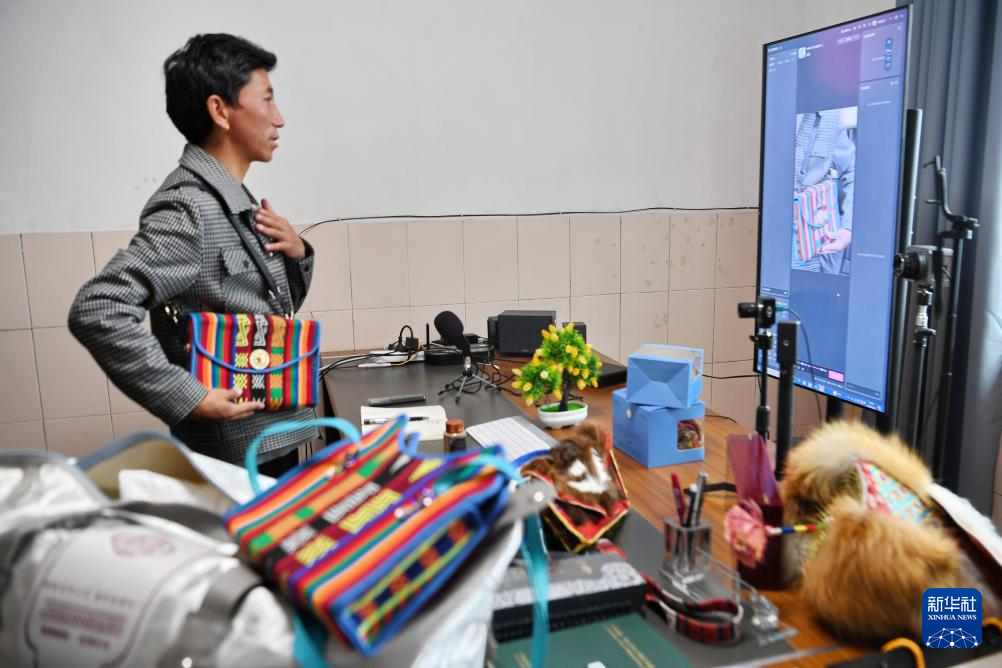 倉(cāng)秋多吉通過(guò)網(wǎng)絡(luò)銷售當(dāng)?shù)氐漠a(chǎn)品(8月24日攝)。新華社記者 張汝鋒 攝