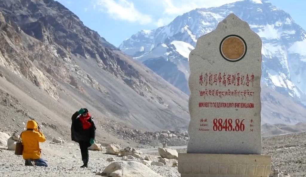 游客在珠穆朗瑪峰高程測(cè)量紀(jì)念碑前拍照留念。(受訪者供圖)