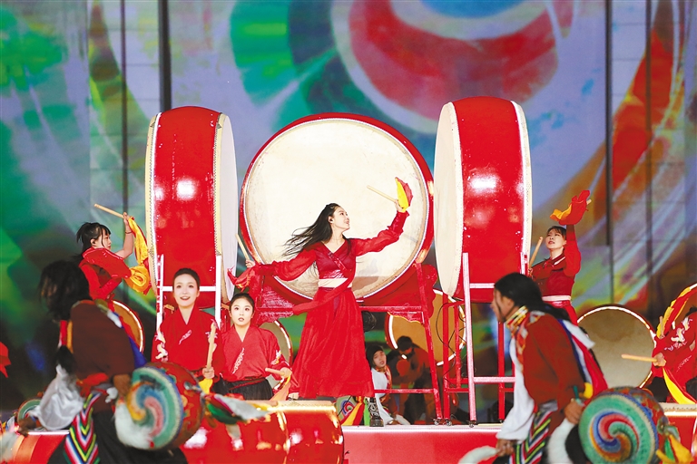 共振共鳴中國(guó)鼓,交流交融民族情。在激昂的鼓聲和大開大合的舞姿中,開幕式序曲《大江之鼓》緩緩呈現(xiàn)在所有人面前。喆友打擊樂(lè)團(tuán)、山南市瓊結(jié)久河卓舞隊(duì)等隊(duì)伍的近70名鼓手同臺(tái)獻(xiàn)藝、默契配合,讓鼓聲共振、情感共鳴,展現(xiàn)了激情洋溢、魅力無(wú)限的中華鼓文化。