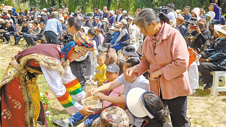 現場設置了工布藏族服飾比賽、傳統(tǒng)美食體驗及農特產品試吃、藏骰體驗等活動。一場別開生面的非遺與美食的碰撞,讓市民、游客盡享“文化大餐”。來自巴宜區(qū)四鎮(zhèn)三鄉(xiāng)的蕎麥餅、酸奶醬、藏香豬、藍莓、玫瑰茶等出現在傳統(tǒng)美食體驗及農特產品試吃活動中,吸引不少市民、游客駐足品嘗,近距離享受著非遺帶來的韻味與魅力。