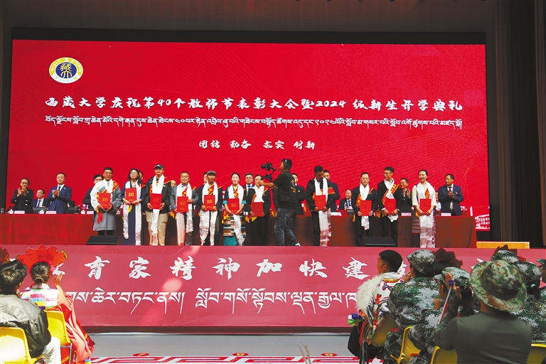 10日下午,西藏大學(xué)在納金校區(qū)雙創(chuàng)活動中心舉辦第40個教師節(jié)表彰大會暨2024級新生開學(xué)典禮?;顒釉跓崆闅g快的暖場歌舞中拉開帷幕,會場內(nèi)紅旗飄揚,氣氛熱烈而莊重,全體2024級新生、學(xué)校各單位主要負(fù)責(zé)人、受表彰師生代表等共計3300余師生齊聚一堂,共同見證這一重要時刻。