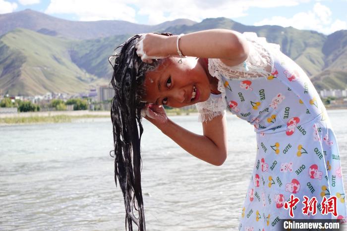 不少兒童在大人的看護下嬉戲玩水,9歲的強久措姆說:“我覺得在河邊洗澡特別有趣,能夠更好地親近大自然,還可以過林卡?!?/p>