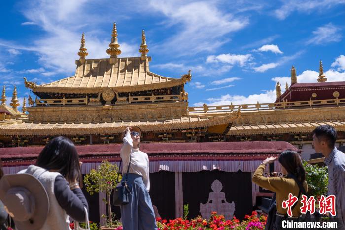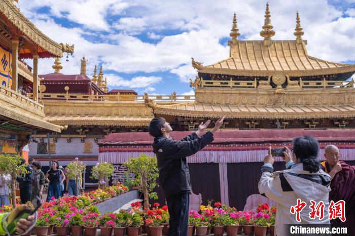 9月17日,游客在西藏拉薩大昭寺金頂前留影。中秋佳節(jié),距今已有1300多年歷史、2000年作為布達(dá)拉宮擴(kuò)展項(xiàng)目列入《世界遺產(chǎn)名錄》的拉薩大昭寺迎來(lái)眾多游客。中新社記者 貢嘎來(lái)松 攝