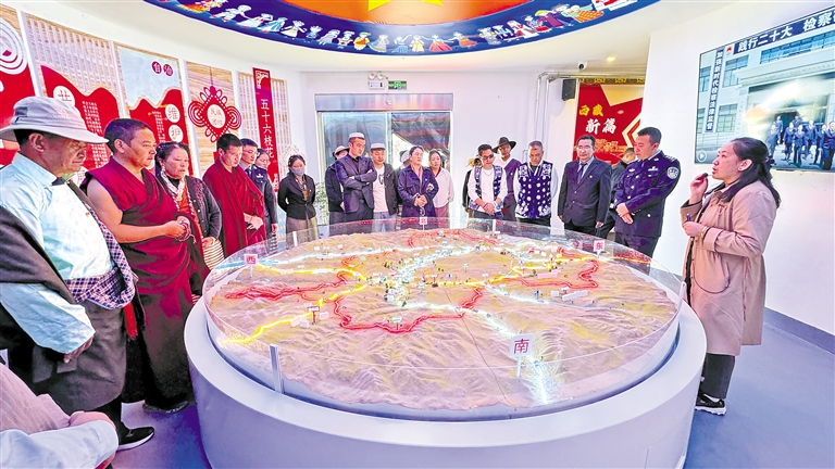 9月14日,拉孜縣曲下鎮(zhèn)以鑄牢中華民族共同體意識(shí)為主線,舉辦首屆“格桑花開石榴紅·凝心鑄魂新征程”運(yùn)動(dòng)會(huì)暨“迎中秋、慶團(tuán)結(jié)”茶話會(huì)?!D為各民族群眾代表參觀拉孜縣鑄牢中華民族共同體意識(shí)教育館。