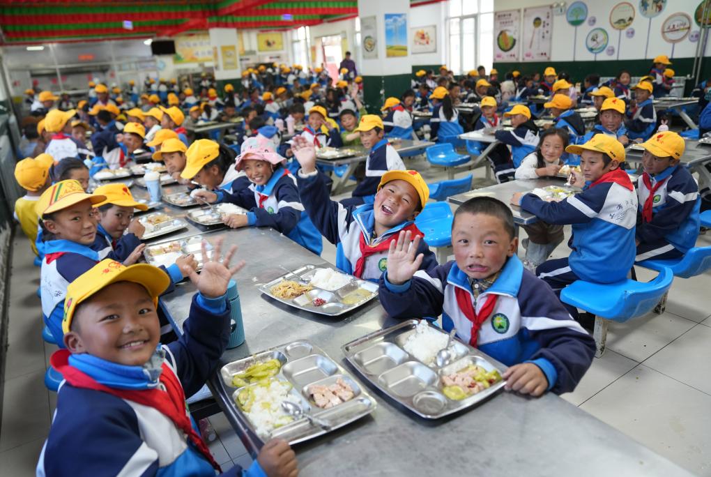 娘蒲鄉(xiāng)中心小學(xué)的學(xué)生們?cè)谙碛梦绮停?月3日攝)。新華社記者 晉美多吉 攝