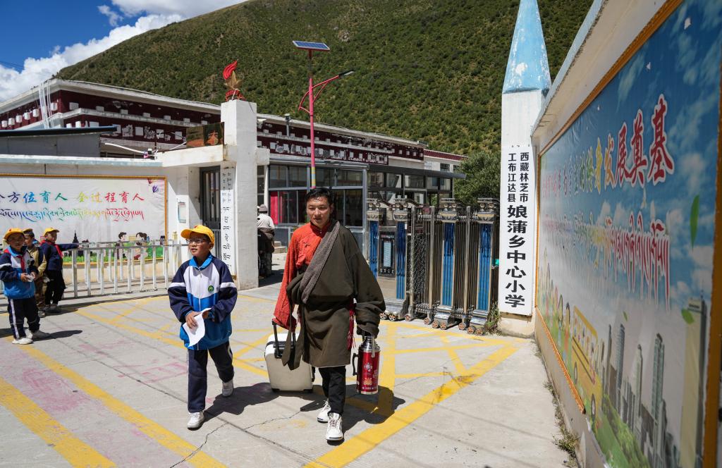 娘蒲鄉(xiāng)中心小學(xué)門(mén)口,王登領(lǐng)著兒子貢喬熱旦(左)準(zhǔn)備回家(9月4日攝)。新華社記者 晉美多吉 攝