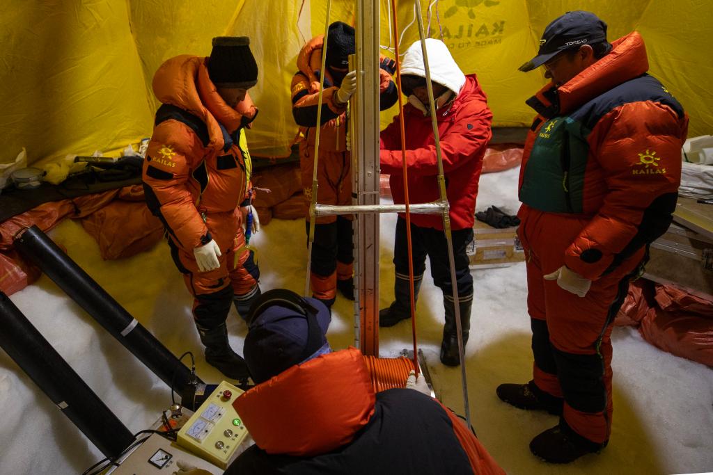 徐柏青(右二)和同事從鉆頭中取出鉆取的冰芯(9月11日攝)。新華社記者 姜帆 攝