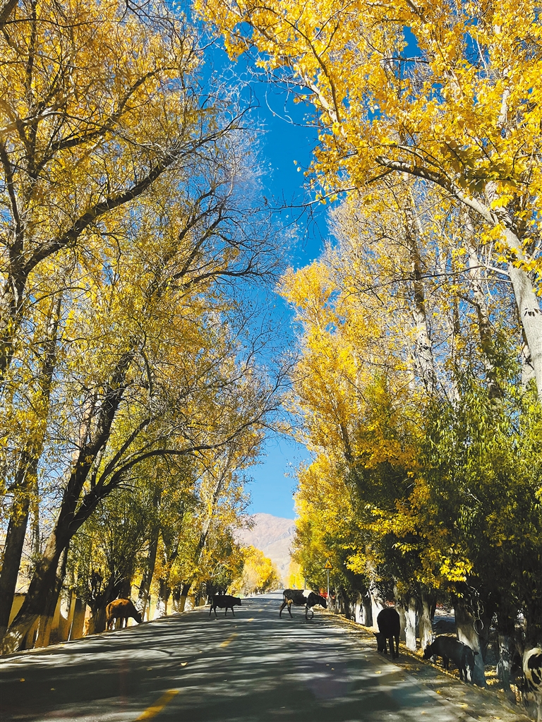 林周縣公路上悠閑的牛。市民小卓嘎供圖