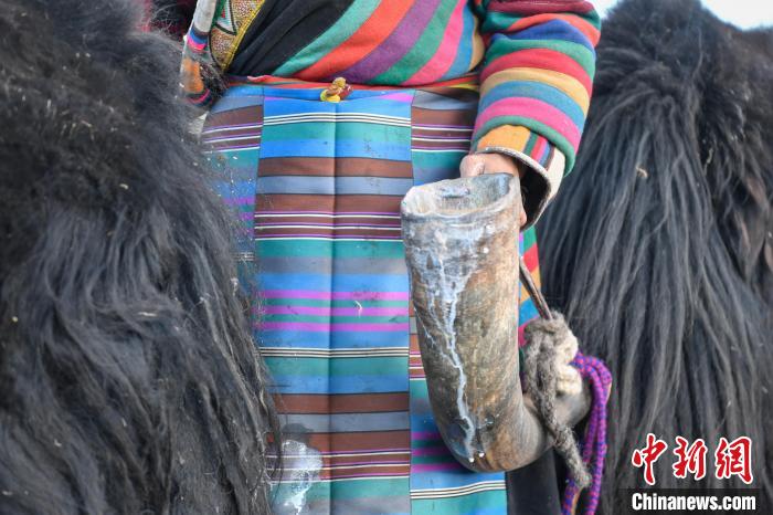 12月12日,西藏自治區(qū)那曲市安多縣帕那鎮(zhèn)牧民土巴卓瑪將擠好的牦牛奶倒入奶桶。中新社記者 貢嘎來松 攝
