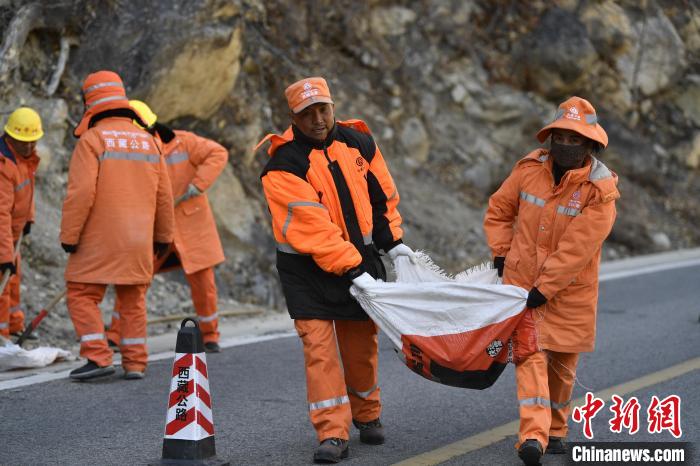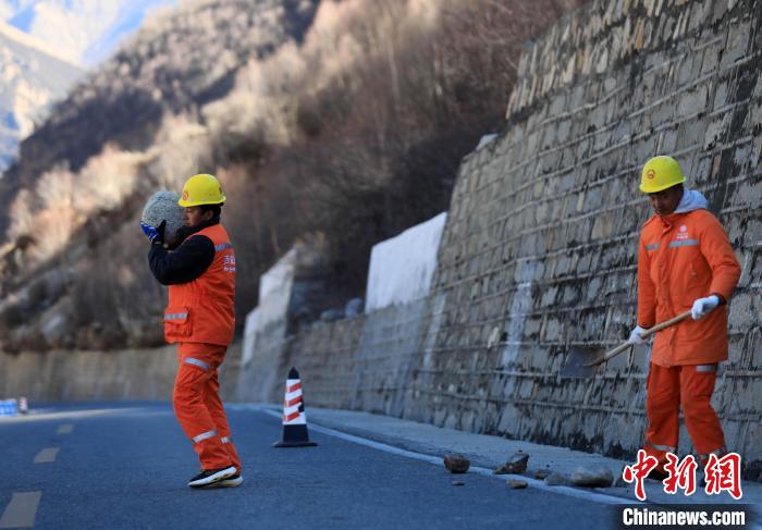 12月16日,西藏自治區(qū)林芝公路事業(yè)發(fā)展和應(yīng)急保障中心(工布江達(dá)養(yǎng)護(hù)段)道路養(yǎng)護(hù)工人及時清除川藏公路上的落石,保障道路暢通。該養(yǎng)護(hù)段擔(dān)負(fù)著川藏公路沿線工布江達(dá)縣路段的養(yǎng)護(hù)管理、應(yīng)急搶險等工作,包括路面修補(bǔ)、清理邊溝、維護(hù)交通安全設(shè)施等日常養(yǎng)護(hù)工作。圖為道路養(yǎng)護(hù)工人清理公路上的落石。中新社記者 貢嘎來松 攝