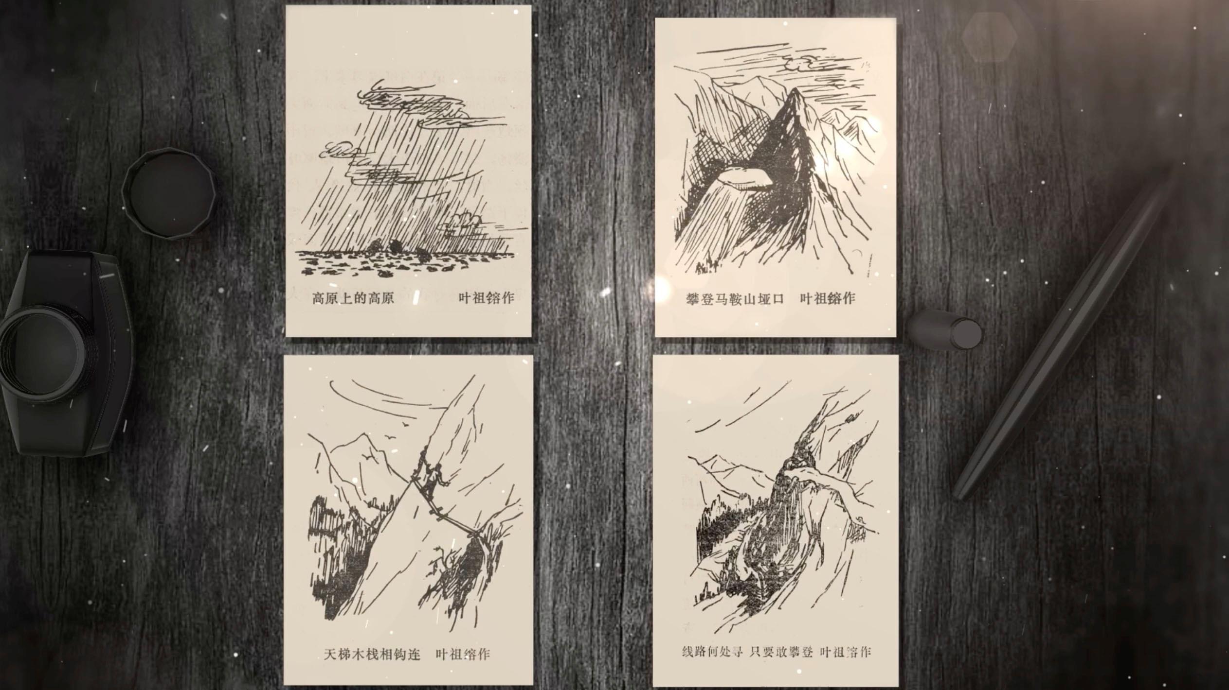 畫稿的作者是葉祖镕。他是踏勘隊中負責(zé)地形圖測繪的成員。在隊長余炯帶領(lǐng)下,深入無人區(qū)進行勘測,與筑路大軍幾近失聯(lián)數(shù)月,但最終冒著生命危險帶回了寶貴的勘測報告。這是葉祖镕當(dāng)年畫的素描畫,高原上的高原、雪山頂?shù)膱嚎凇⒔^壁間的天梯、險峰中的窄路、踏勘隊沿途經(jīng)歷的各種地形,保留在這四張手繪中,它們見證著在生死之間,踏勘隊員的樂觀豁達、無所畏懼。