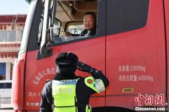 圖為交警對貨車檢查后敬禮放行。中新社記者 貢嘎來松 攝