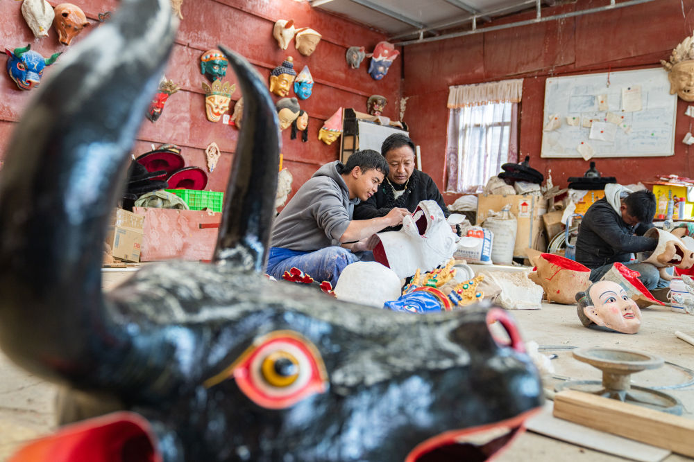 拉薩達(dá)孜區(qū)雪鄉(xiāng)民間傳統(tǒng)手工藝農(nóng)民專業(yè)合作社的面具制作工匠制作傳統(tǒng)面具。