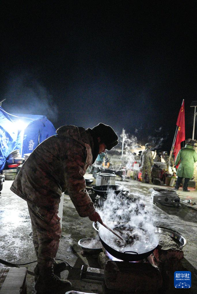 1月7日,在定日縣古榮村集中安置點,解放軍為受災(zāi)群眾做飯。新華社記者 晉美多吉 攝