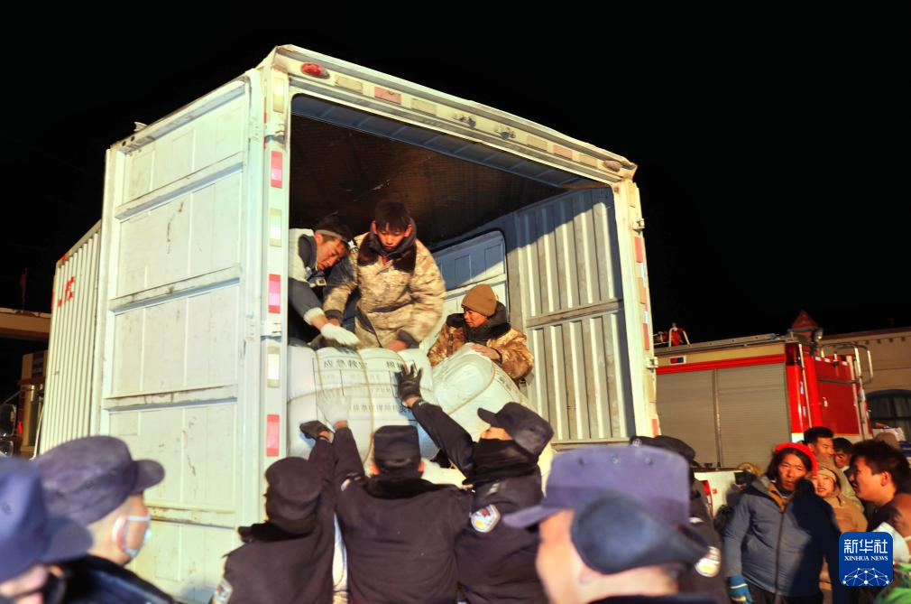 1月7日,救援人員在定日縣措果鄉(xiāng)裝運救災(zāi)物資。新華社記者 姜帆 攝
