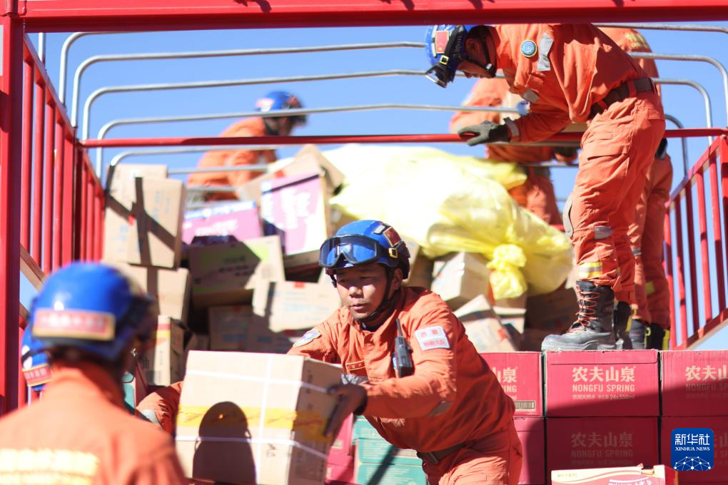 1月9日,救援人員在措布村卸載救災(zāi)物資。新華社記者 姜帆 攝