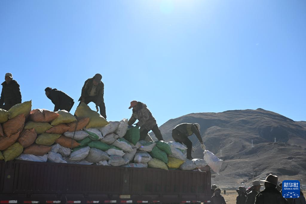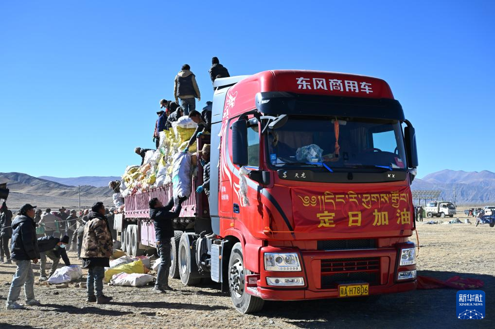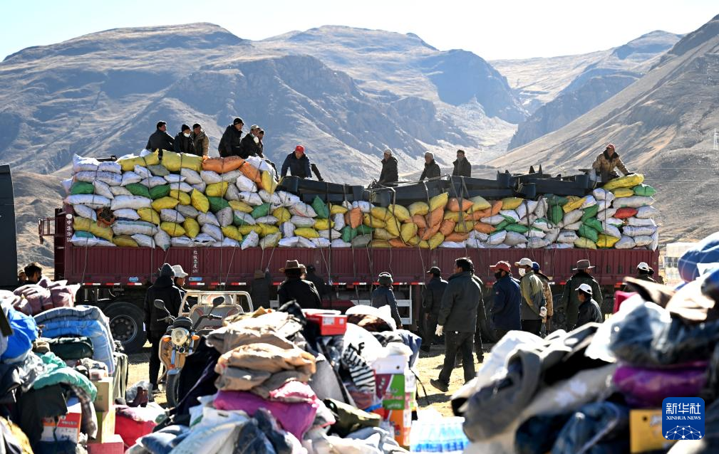 1月9日,受災(zāi)群眾在措布村卸載救災(zāi)物資。新華社記者 李響 攝