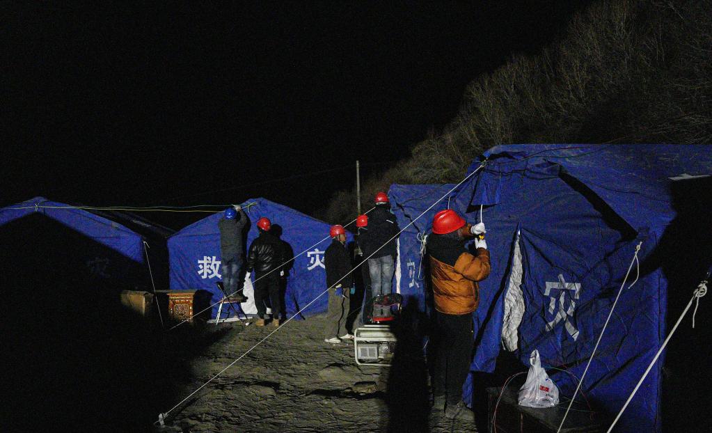 1月7日,在定日縣長所鄉(xiāng)集中安置點,工作人員在保障電力供應。