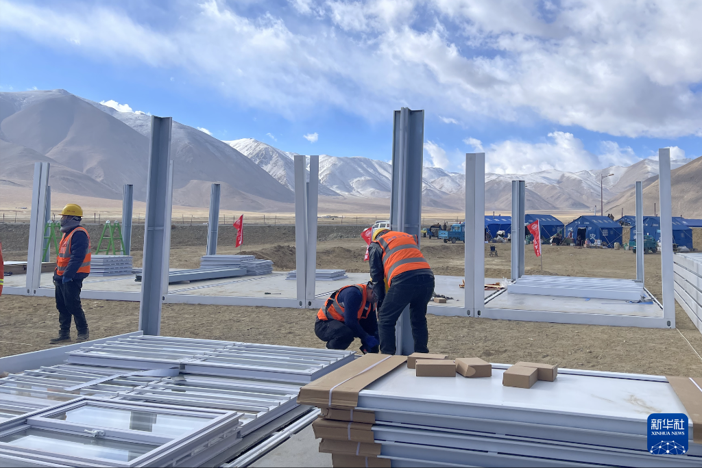 1月13日上午,中鐵二十局工作人員在定日縣措果鄉(xiāng)雪珠村安置點(diǎn)搭建活動板房。新華社記者蔣夢辰 攝