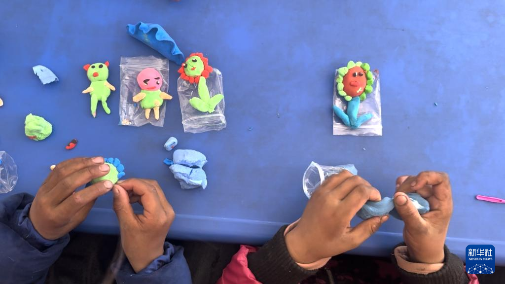 1月13日中午,在定日縣曲洛鄉(xiāng)措娃村安置點(diǎn)的兒童友好空間,孩子們在社工指導(dǎo)下捏塑超輕黏土。新華社記者索朗德吉 攝