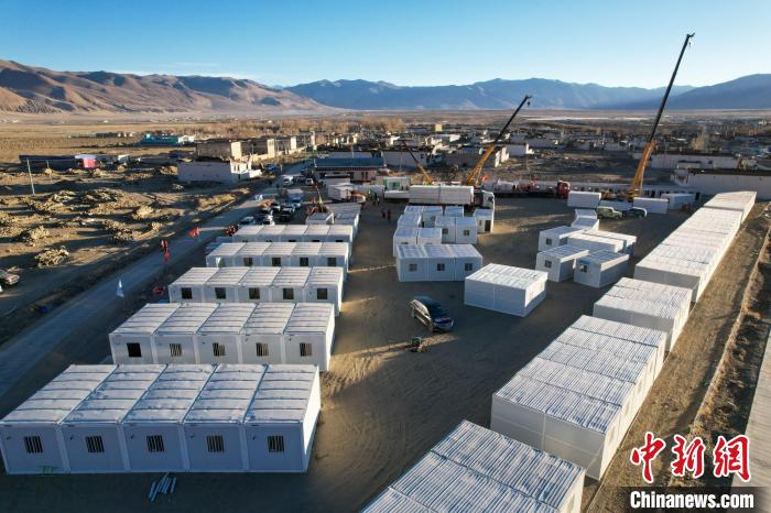 圖為1月10日,西藏定日縣長所鄉(xiāng)森嘎村正搭建移動(dòng)板房。(無人機(jī)畫面)江飛波 攝