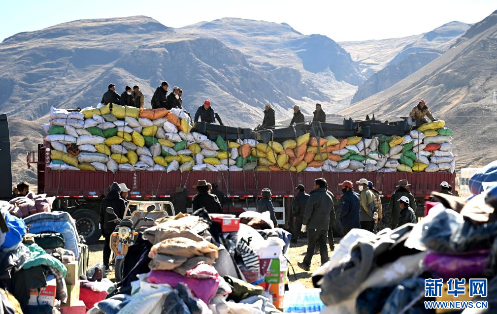 1月9日,受災(zāi)群眾在拉孜縣拉孜鎮(zhèn)措布村卸載救災(zāi)物資。新華社記者 李響 攝