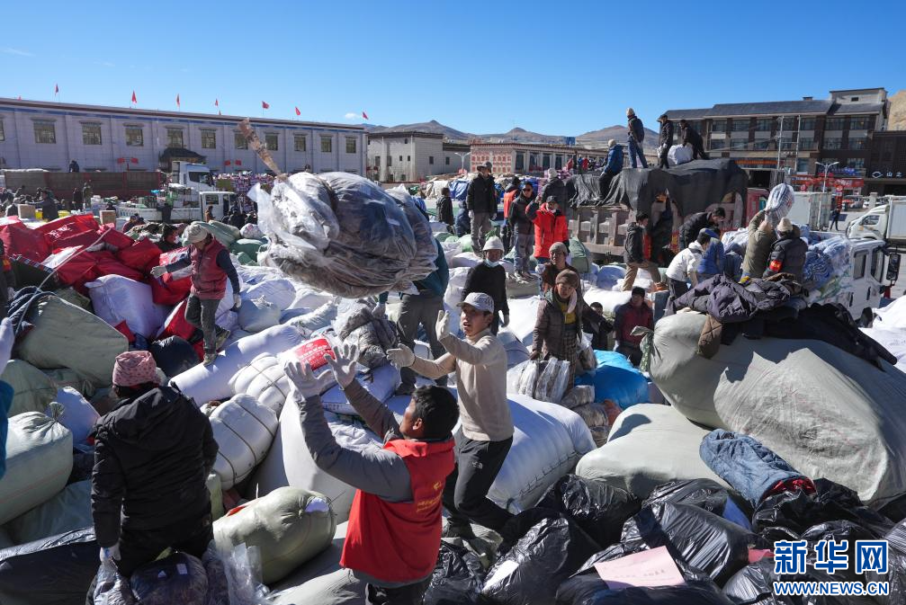 1月10日,在定日縣民族團結(jié)廣場,人們搬運將要運往受災(zāi)群眾安置點的過冬物資。新華社記者 沈伯韓 攝