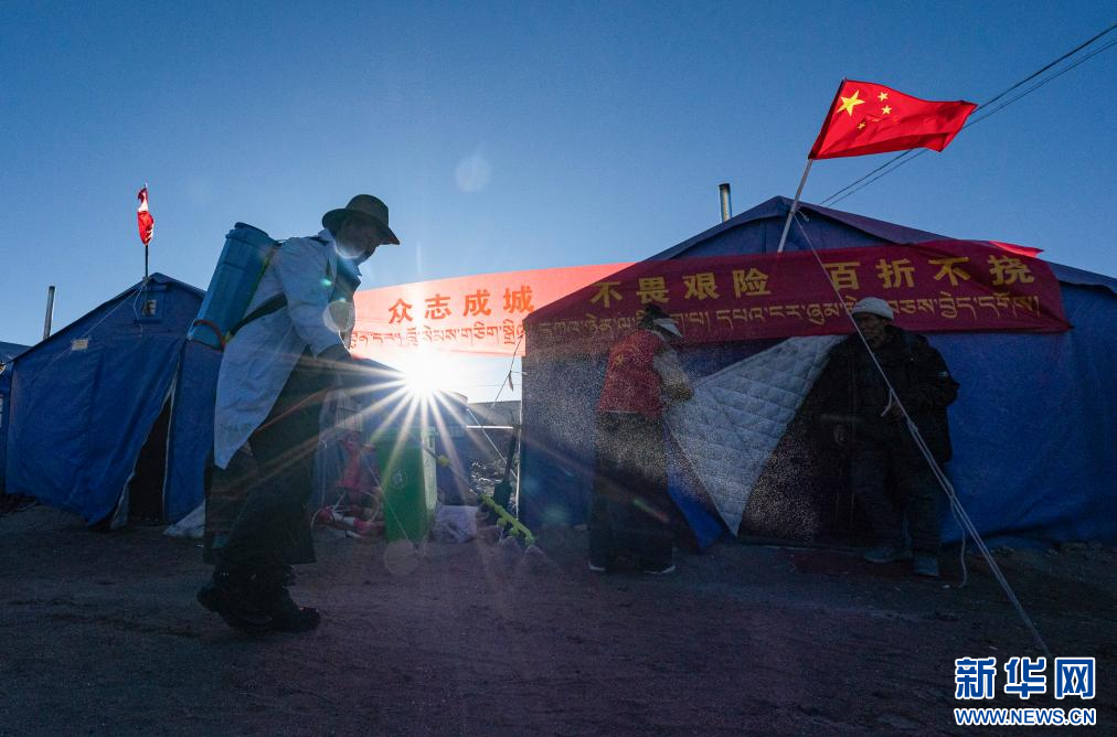 1月10日,在定結(jié)縣郭加鄉(xiāng)乃村安置點,村民在進行消殺工作。 新華社記者 丁增尼達 攝