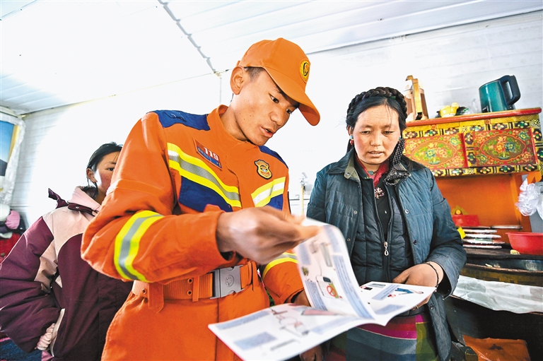 消防員為薩迦縣麻布加鄉(xiāng)普村安置點(diǎn)群眾講解用電和防火知識。記者 唐斌 攝