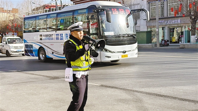 拉薩市城關(guān)區(qū)娘熱路上,交警在指揮車輛通行。記者 余書冉 攝