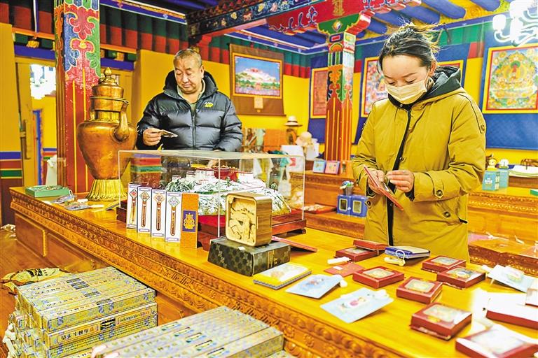 圖為市民在羅布林卡文創(chuàng)精品館選購特色非遺文創(chuàng)產(chǎn)品。記者 丹增群培 攝