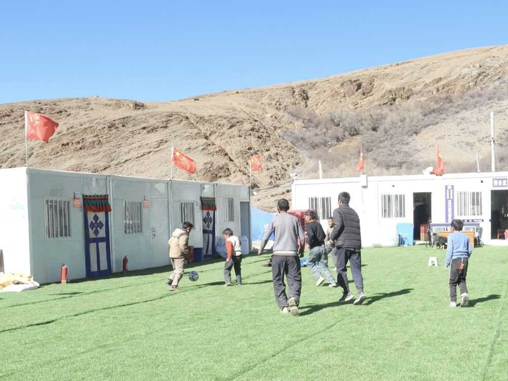 1月27日,在定日縣長所鄉(xiāng)古榮村板房安置點(diǎn),孩子們正在踢足球。(受訪者供圖)