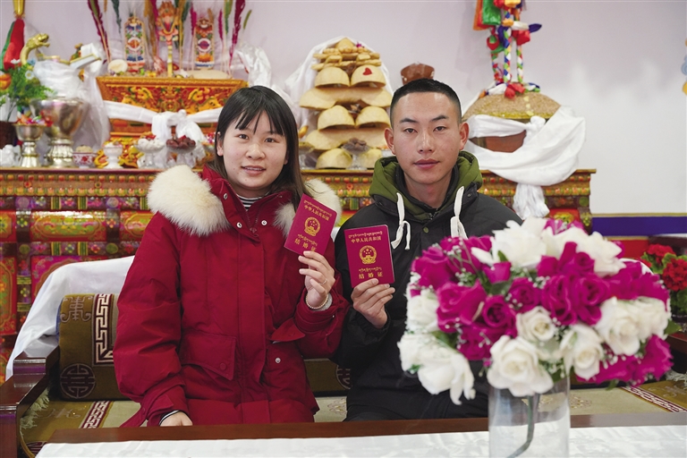 “我們在一起3年了,是表姐牽的紅線。”旦增嘎瓦臉上洋溢著幸福的笑容,緩緩說道,“初次見到卓嘎,我就對她心生好感。相處一段時間后,我發(fā)現(xiàn)她性格溫柔,和我特別合拍,于是鼓起勇氣向她表白。”他開心地展示著剛剛領(lǐng)到的結(jié)婚證,“情人節(jié)是個好日子,我們早就計劃好今天領(lǐng)證,現(xiàn)在終于如愿以償。以后情人節(jié)和結(jié)婚紀念日合二為一,既能少買一份禮物,也不用擔心忘記啦?!?/p>