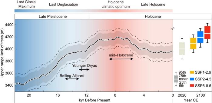研究結(jié)果顯示,青藏高原平均樹線海拔在末次冰期最低(約3426米);全新世大暖期(距今約8000年)達到最高(約4187米),比當前的平均樹線(約4009米)高約180米。冰期與間冰期樹線波動幅度高達850米,導致間冰期高山特有物種棲息地面積僅為冰盛期的約50%。