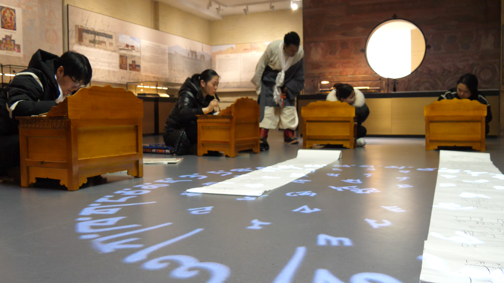 2月28日是藏歷新年初一,市民和游客在西藏博物館展廳參加藏文書法互動體驗(yàn)活動(2月28日攝)。新華社記者吳思思 攝