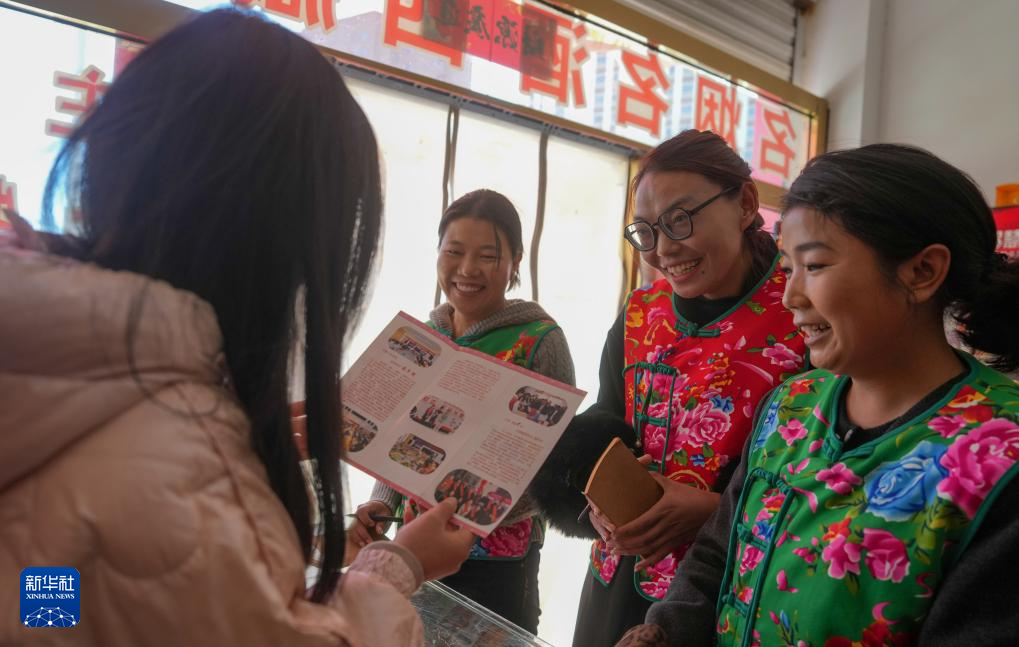 “花大姐”向轄區(qū)商戶發(fā)放議事會(huì)宣傳材料(3月6日攝)。新華社記者 晉美多吉 攝