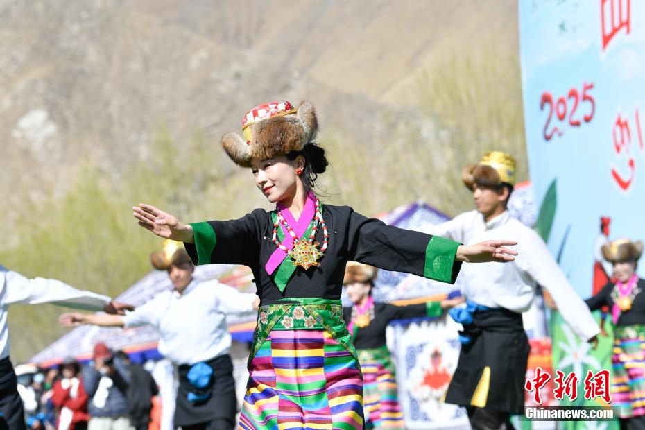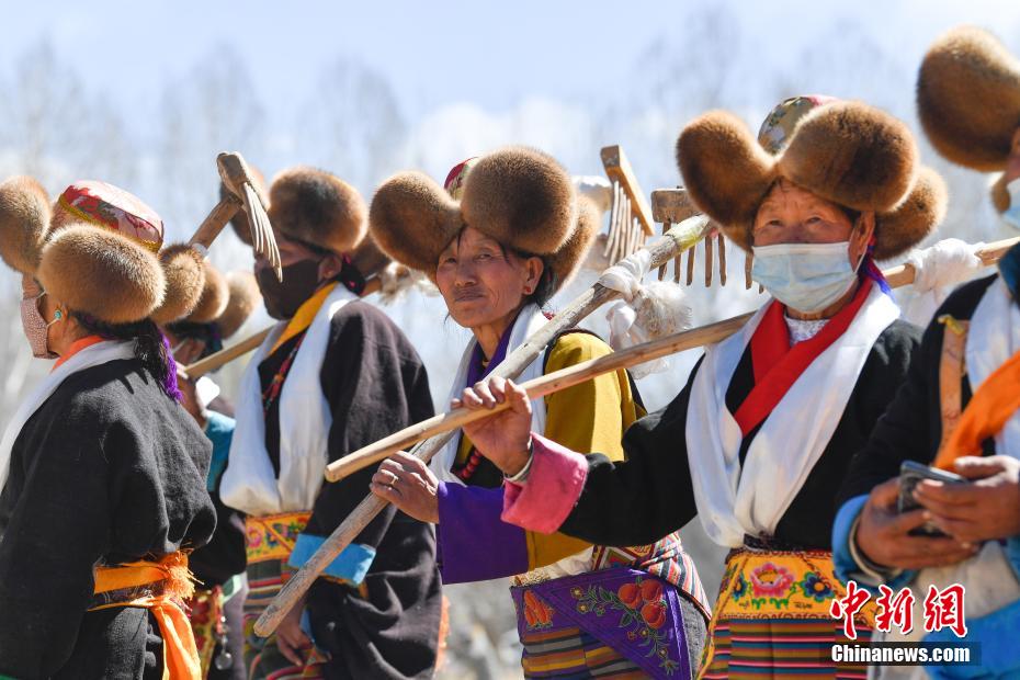 3月16日,西藏拉薩迎來一年一度的傳統(tǒng)春耕儀式。當(dāng)日,拉薩市曲水縣色達(dá)村村民身著節(jié)日盛裝,相聚在田間,載歌載舞,共同迎接春耕第一犁。家家戶戶端著自家的“切瑪”(象征五谷豐登)帶著青稞酒、酥油茶等物品聚在田間,互敬青稞酒,開始撒種,祈求全年風(fēng)調(diào)雨順、五谷豐登。圖為曲水縣色達(dá)村春耕儀式現(xiàn)場,當(dāng)?shù)孛癖姳硌輫壹壏俏镔|(zhì)文化遺產(chǎn)《吉祥仲孜》。中新社記者 貢嘎來松 攝