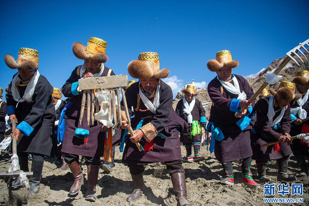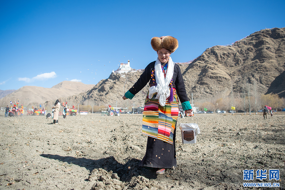 16日,西藏山南市乃東區(qū)門(mén)中崗社區(qū)的群眾按照傳統(tǒng)儀式,身著盛裝,手捧青稞酒,在雍布拉康宮殿腳下的西藏“第一塊農(nóng)田”舉行春耕儀式,播撒今春第一粒種子。