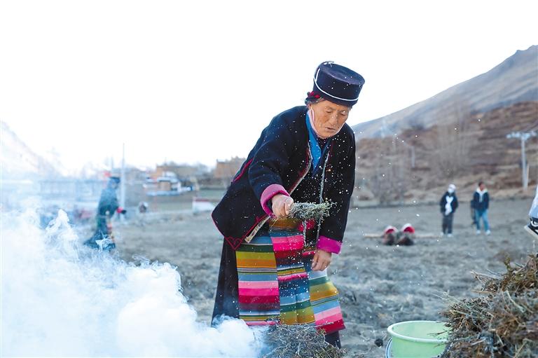 林芝市工布江達(dá)縣工布江達(dá)鎮(zhèn)阿沛村村民手捏糌粑撒向點(diǎn)燃的青岡樹堆,祈求風(fēng)調(diào)雨順。記者 謝筱純 攝