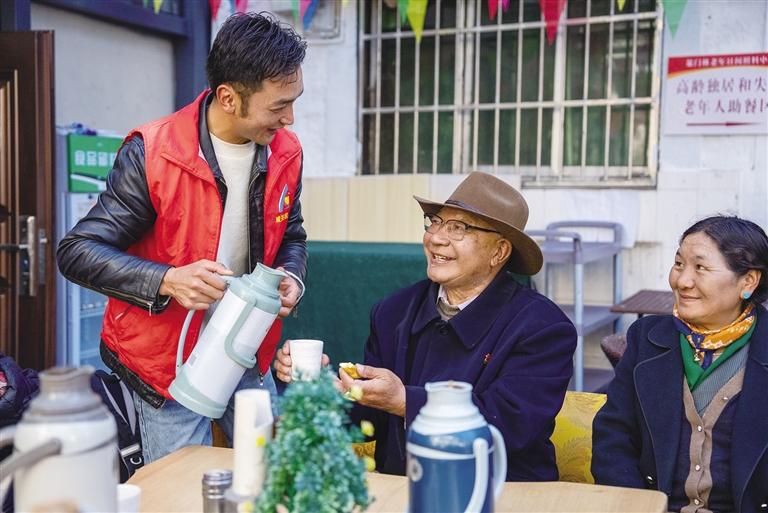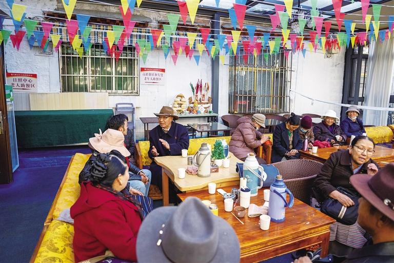 “波啦,您來(lái)啦,快坐下來(lái)喝點(diǎn)熱茶。”“莫啦,待會(huì)午飯?jiān)谶@邊吃嗎?”近日,記者來(lái)到拉薩市城關(guān)區(qū)蕃陽(yáng)社會(huì)工作者和志愿者服務(wù)協(xié)會(huì)下的策門(mén)林老年日間照料中心,剛進(jìn)大門(mén)就被一群正在鍛煉身體的老人所吸引。他們跟著老師抬手、踢腿、扭腰,動(dòng)作整齊劃一,臉上洋溢著幸福的笑容。鍛煉結(jié)束后,赤來(lái)回到助餐區(qū),邊喝甜茶邊吃“卡賽”,和老人們分享趣聞,拉著家常,現(xiàn)場(chǎng)傳來(lái)一陣陣歡聲笑語(yǔ)。