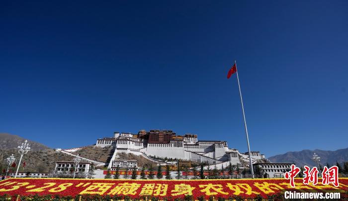 圖為3月28日,西藏布達(dá)拉宮廣場(chǎng)擺放西藏百萬農(nóng)奴解放紀(jì)念日標(biāo)語。李林 攝