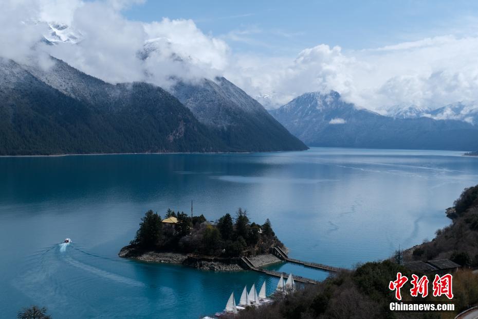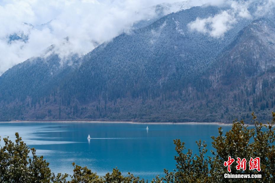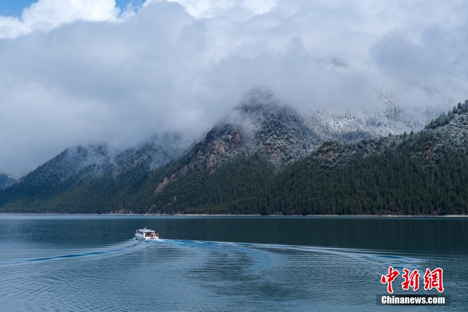 巴松錯位于西藏林芝工布江達縣境內,地處巴河上游的高山峽谷中,是西藏首個自然風景類國家5A級旅游景區(qū)。4月5日,巴松錯迎來一場春雪,雪后四周原始森林猶如蒙上潔白面紗,湖面宛如一面藍寶石鑲嵌其中,風光如畫。圖為4月5日,游客乘船游覽巴松錯。中新社記者 江飛波 攝